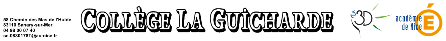 REORGANISATION DE LA RENTREE 2025-2026 Les élèves du collège la Guicharde à Sanary-sur-Mer sont attendus aux jours et horaires mentionnés dans le tableau ci-dessous. Précision pour les élèves de 6ème : Rentrée Mardi 2 septembre (PAS DE COURS LE MERCREDI 3 ET REPRISE NORMALE LE JEUDI 4 )